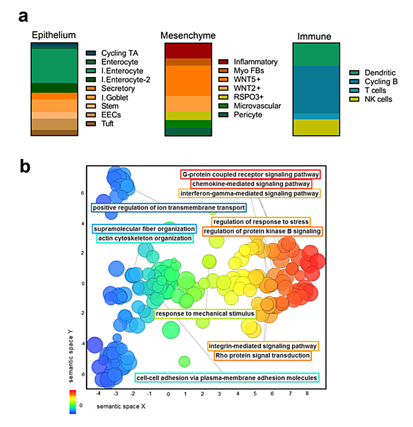 (a) Single nucleus RNA-Seq analysis showing the presence of multiple cell types, including an immune cell signature exclusive to IBODs. Proportional plots illustrate subpopulations by cell type in IBODs. Cycling TA = cycling transient amplifying cells; I. enterocyte = immature enterocytes; I. goblet = immature goblet cells; Myo FB = myofibroblasts; cycling B = cycling B cells; NK = natural killer cells. (b) Enriched GO terms in IBODs vs. NODs, visualized as REVIGO scatterplots (P < 0.001). Terms are distributed along the X-axis based on semantic similarity of biological processes. Circle color indicates biological function; circle size reflects the number of genes associated with each term.